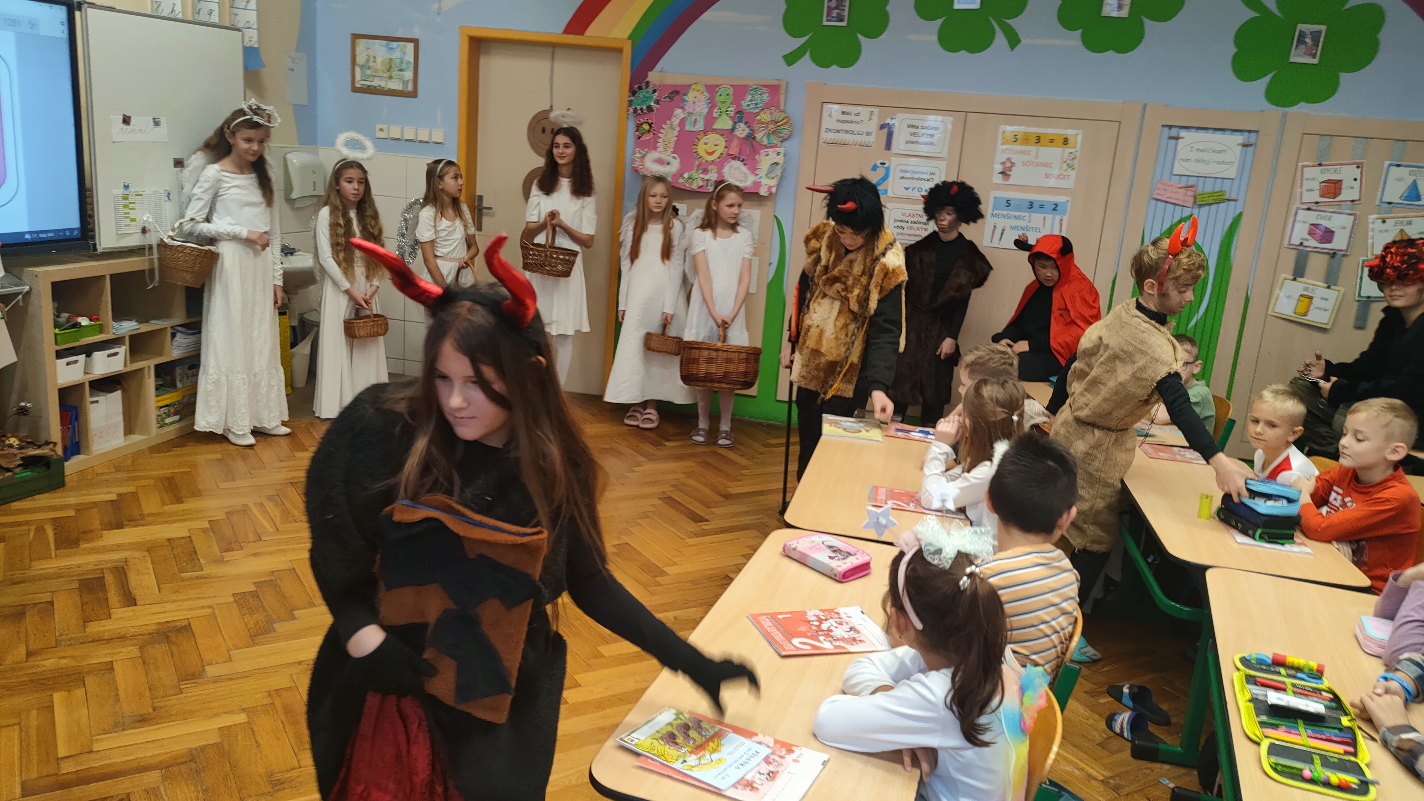 Z Národního muzea jsme metrem dojeli na Vyšehrad. Rozdělili jsme se s dětmi z 2.A do čtyř skupin. Každá ze skupin dostala list s jednou pověstí. Pověst jsme si museli přečíst a naučit se ve skupině vyprávět. Četli jsme pověst o Krokovi a jeho dcerách, O Libuši a Přemyslovi, O Ctiradovi a Šárce a o Horymírovi a Šemíkovi. Každou pověst vždy daná skupina vyprávěla ostatním skupinám. Při vyprávění jsme využili v parku krásných sousoší Libuše a Přemysl a Ctirad a Šárka. Pověst o Horymírovi nám poslední skupina vyprávěla přímo na hradbách nad řekou Vltavou.